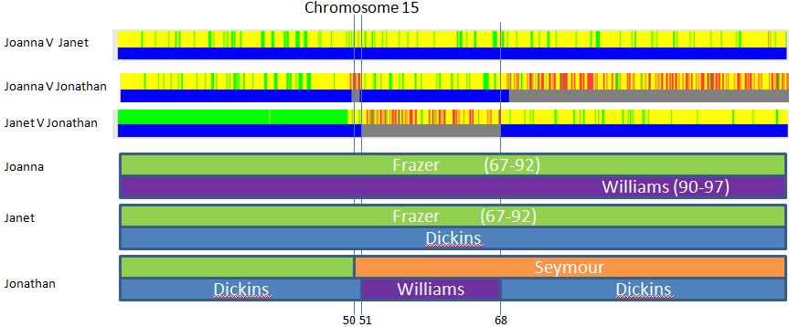 This has to be right. Purple is Joanna’s only unique color in the 90-97 area. And only Joanna had a Williams relative match. Likewise, Joanna and Janet had Frazer matches from 67-92. Green is the only color those two sister have in common in that area.