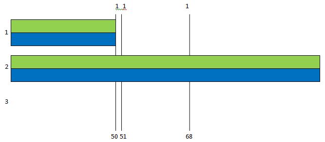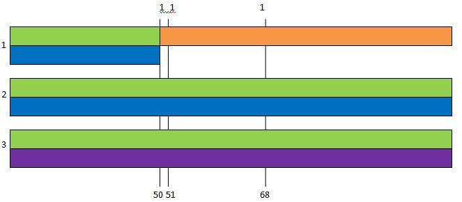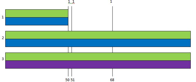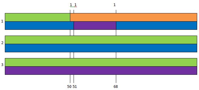Jonathan has all the crossovers here. Janet and Joanna don’t have any. The crossovers are where the grandparents change. As Janet has no change (crossover), we’ll say she got her DNA from the same 2 grandparents along her whole Chromosome 15. Then I added numbers at the bottom. These are where the matches start and stop (rounded to the nearest million) between the 3 siblings as shown in the gedmatch comparisons above:JL Chr 15 Seg 2