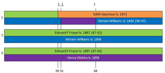 I went wrong above when I assigned Miriam to orange. This was based on Jonathan having a match with a Miriam relative and Janet (2) having no match with that same relative. I did have a little qualm about doing this but reasoned thusly: “If Jonathan had a match and Janet didn’t, then it had to be orange.” Also why wouldn’t Janet have a Williams relative match? She has all that blue area to match. So I’ll have to take note not to make that assumption again. I suppose it’s one of those situations where absence of proof is not proof of absence. Fortunately, the Frazer matches bailed me out of my bad assumption.