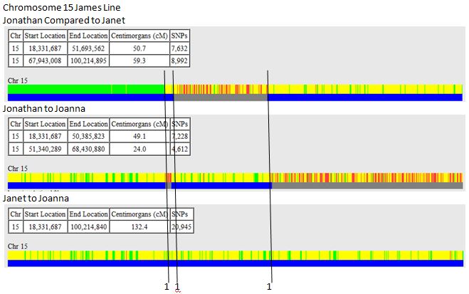 Here green is a Fully Identical Region (HIR), red is no match, and yellow is a Half Identical Region (HIR). Janet and Joanna match as a HIR for the whole length of Chromosome 15 That means they will share one granparent’s DNA for the whole Chromosome 15. Next I add the crossover points for all 3 and assign one person to each. This is the person that appears in 2 out of 3 of the crossovers. Well, here is something I haven’t run into before. All the crossovers belong to Jonathan (1):James Line Chr 15 Crossovers