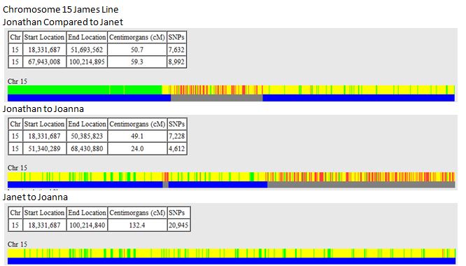 First, I go to gedmatch and compare Joanna’s three siblings to each other: Jonathan (1), Janet (2) and Joanna (3).James Line Chr 15