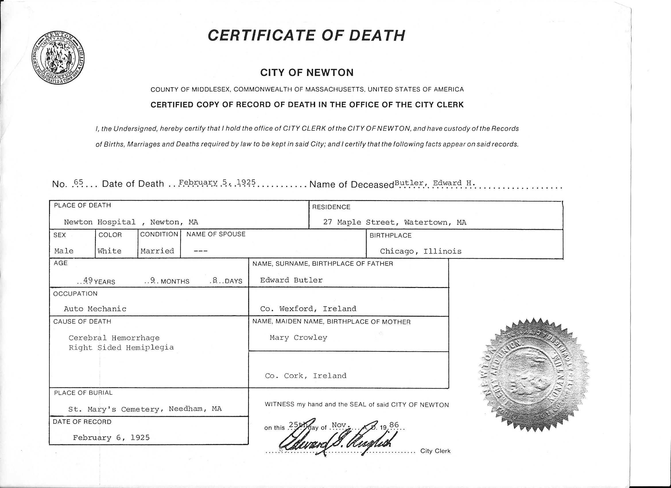 Ten years later in 1925, his son, Edward H Butler died and recorded that his father was born in County Wexford, Ireland. Why had his birthplace changed in 10 years?
