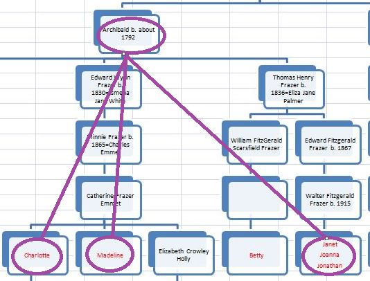 First, I’ll say that I won’t bother triangulating Charlotte, Madeline and Mary. That triangulation would only point to the parents of Charlotte and Madeline and they already know who their parent are. Plus one of their parents is not a Frazer.
