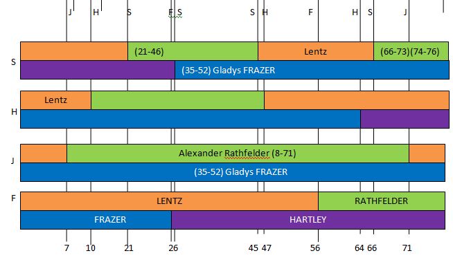 Below is a chromosome map that I updated now that my brother’s DNA results are in. This indicates the DNA that my 3 siblings and I got from our 4 grandparents. The maternal side is in orange and green and the paternal grandparents are shown in purple and blue. My brother Jon’s yellow match with Judy above is within the orange area of the bottom F bar below. Sharon’s green bar match with Judy above corresponds to the second orange segment below on the S row. Heidi’s blue bar match above corresponds to her second orange (Lentz) segment below on the H row. I match my mother’s father’s Rathfelder side for most of Chromosome 18. That is shown in green in the 4th bar below (J row). So I didn’t inherit any Annie Nicholson DNA here where my 3 siblings did.