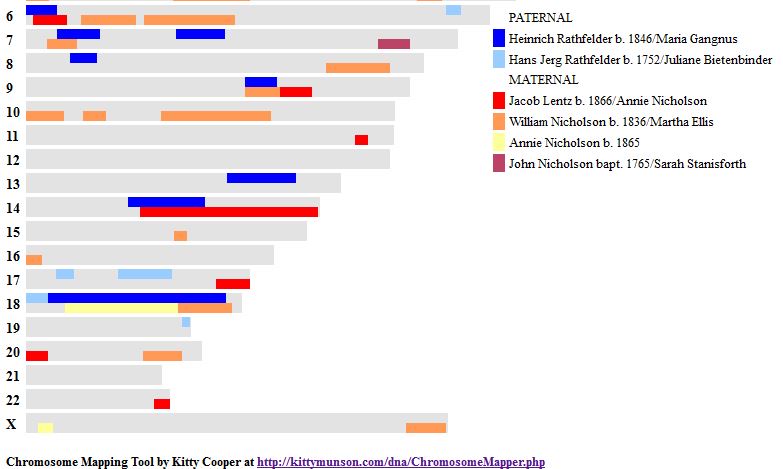 The practical part is that whenever someone matches my mom’s maternal side on that portion of Chromosome 18, she will know that it is a Nicholson (or Nicholson ancestor) match and not a Lentz match.