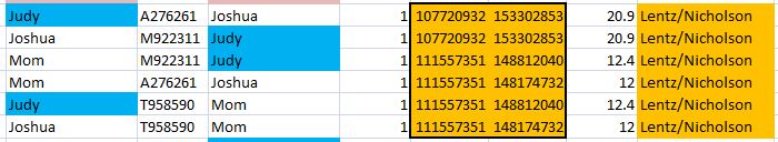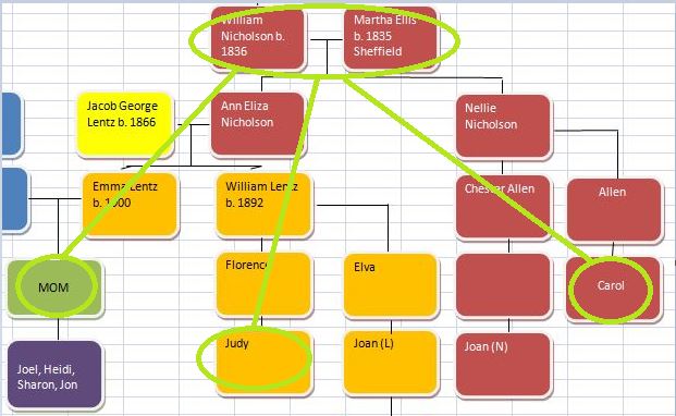 This method maps to our 4 grandparents, so Nicholson is not shown. Annie Nicholson is one of my 8 great grandparents. However, we now know that two of my sisters’ and my brother’s orange bars came from our great grandmother Annie Nicholson by way of her Lentz daughter.
