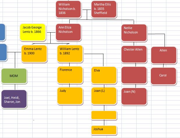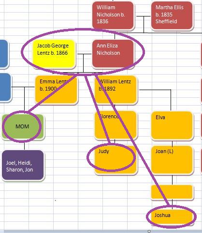 Judy descends from our common Lentz/Nicholson Line. Others that I have been in touch with and have tested for DNA are just from the Nicholson Line. The Nicholson Line is in red. The Lentz line is in yellow. The Lentz/Nicholson Line is in orange. From my early school days, I recall that if you mix yellow and red, you get orange. Judy and Joshua are on the orange line. My mom shows as green, but for the purposes of this Blog, can be considered orange also.