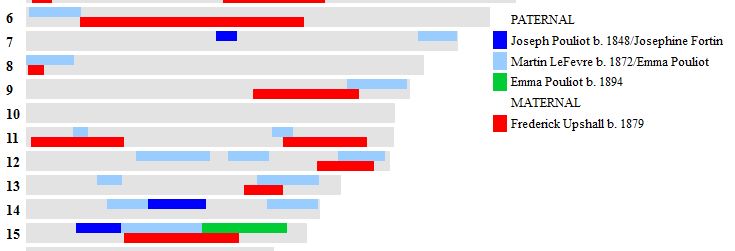 The legend on the top line is difficult to read, but Pouliot is the darker red. More specifically, that would be Emma Pouliot. Marie is on the bottom line. The last vertical white line in Marie’s dark red area represents position 198. As I had mapped Emma from 197 to 207, that would put her in the end of the dark red area of Richard’s Pouliot maternal grandmother, before Marie’s DNA switches to the DNA she got from her dad’s paternal side in the salmon color. So at least my work agrees with MacNeill in this little area.