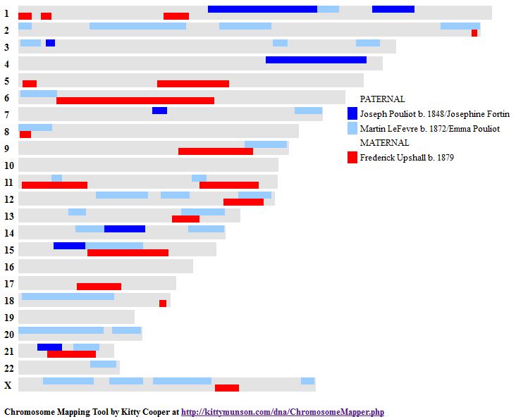 The previous map had 2 blue segments on Chromosome 20 representing either of Marie’s paternal grandmother’s parents. We didn’t know which. Now it shows the one large segment taking up all of Chromosome 20 from her known paternal grandmother. The green should say Estelle LeFevre b. 1904 – not Emma Pouliot b. 1894.