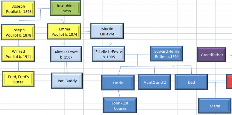Basically, right now if Marie compares herself to John or her 2 Aunts Lorraine and Virginia, she doesn’t know if the shared DNA is from Estelle LeFevre or Edward Butler. However, a triangulation group (TG) with Fred, Fred’s sister, Pat or Buddy and John, Lorraine or Virginia, will show that DNA to be from Estelle LeFevre. Further, not just the match in common to the TG will be from Estelle, but the entire segment represented by Marie’s match to John or her 2 Aunts will be from Estelle.