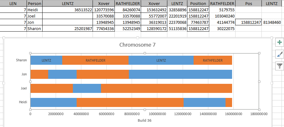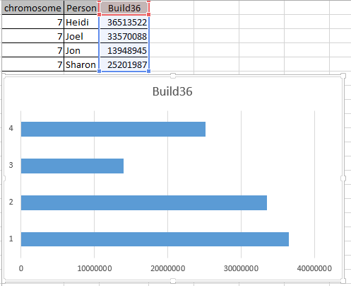 I got this by choosing the Build 36 column and choosing Insert Stacked Bar. I suppose a better Title would have been Chromosome 7 Maternal Crossover rather than Build 36. This was taken from my Column Header. The goal is to get a 2 color bar above. However, I already see a problem. The bar needs to be different colors for different people. Well, I have to start somewhere.