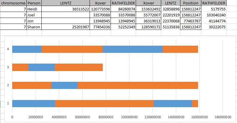 My Excel Bar Chart order is Sharon, Jon, Joel, Heidi. My visual phasing order is Sharon, Joel, Heidi, Jon. The 2 maternal colors I have above are green and orange representing Lentz and Rathfelder. If I keep orange as Rathfelder, that means I want to change bar 2 and 3 (Joel and Jon) on the Excel Bar Chart. One way to do this is to move over the first Crossovers for Joel and Jon in my spreadsheet: