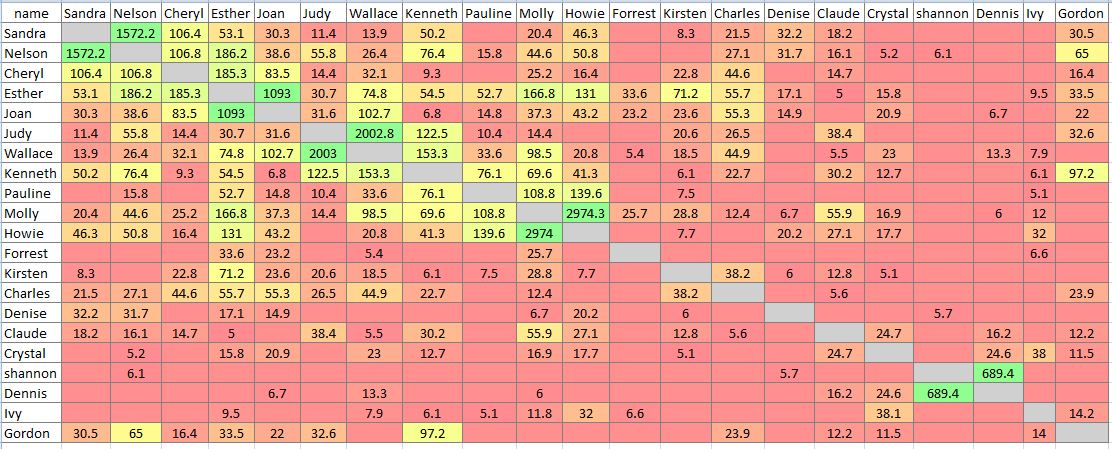 Here I see 2 TGs and some people that are not in the 2 TGs. First is Charles, Joan and Esther in gold. Then there is Nelson, Gordon, Charles, Kenneth and Judy in the pink TG. Howie, Molly and Pauline would be in a TG, but siblings are generally not considered as part of a TG trio. That is because they had to get all of their DNA from their parents, so it would be like 2 people if you consider Molly and Howie as their parent and Pauline as the other person.