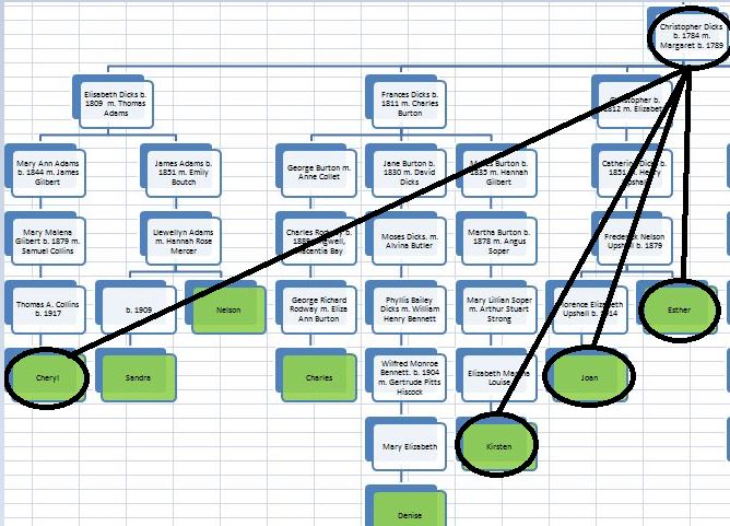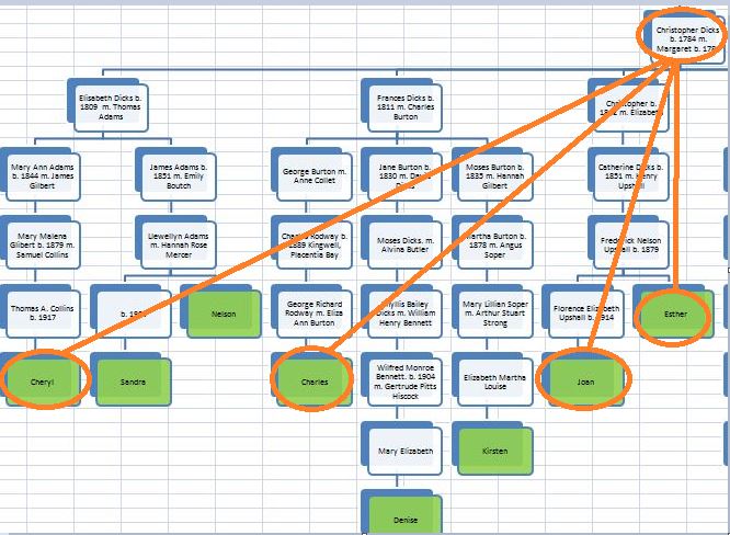 I recently came across two new Dicks descendants’ DNA results. One is for Cheryl and the other is Charles. They are both from the Christopher Dicks Line of Newfoundland, born 1784. The group is getting big, so here is part of the Christopher Line: