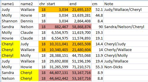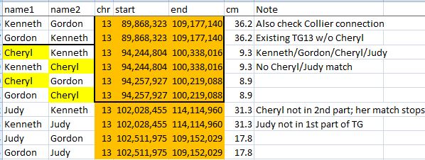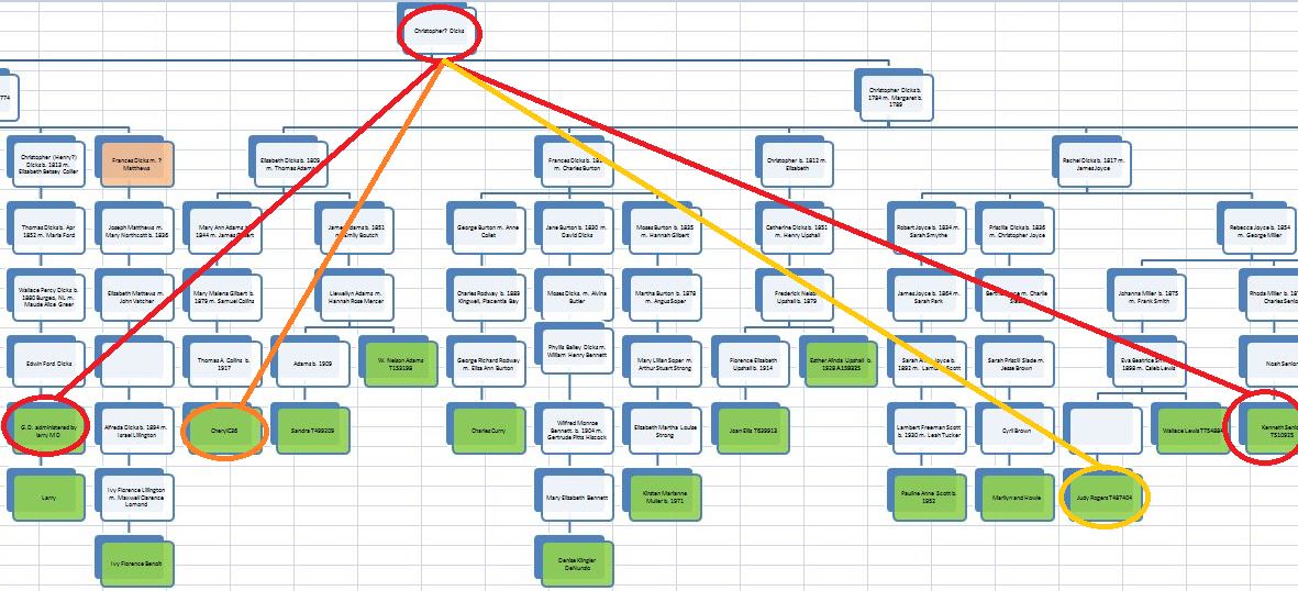 Here I have Gordon and Kenneth in red. Cheryl is in TG13A and Judy in yellow (TG13B). Again, this chart is focused on the Dicks family. There is a possibility that there could be another family in common between these lines that I don’t know about.