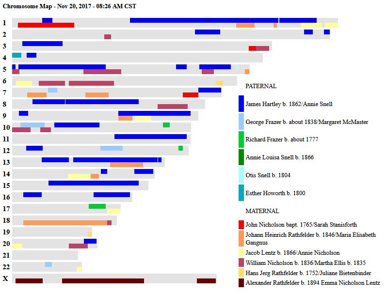 This is not a big segment that is added in lighter blue, but it about doubles what I had already on Chromosome 4. Also it goes back in time three generations from what I had belonging to either James Hartley or Annie Snell shown in darker blue.