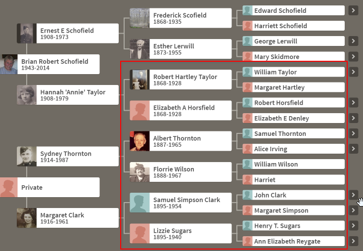 This goes to the 3rd great grandparent level for Lee. Lee has 32 3rd great grandparents, but I narrowed that down to 18. These 18 are based on their birth being in or around Colne, Lancashire. The top line of Lee’s ancestry is difficult to see but the births range from between 1811 on the left to 1837 on the right. That is about a generation of difference from left to right.