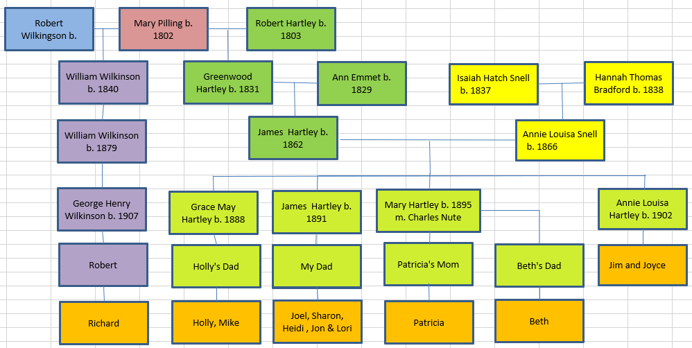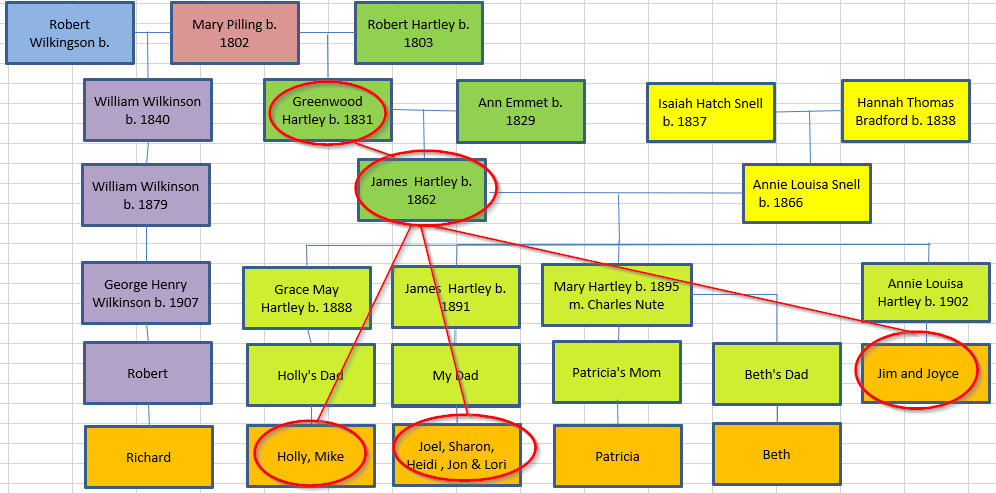 At this level of connection, I would be a 5th cousin once removed to Lee. Jim and Joyce would be 4th cousins twice removed. There is even a third possibility. Under the third scenario, Mary Pilling would be the mother of one of Lee’s descendants. This is theoretically possible, but I don’t see this as likely as I believe I have accounted for all her children. She had a child before marrying Robert Hartley. He moved to the US and married. He had another daughter by Robert. This was Ann Hartley. She married a Cockrill. Mary remarried a Wilkinson, but I think I have accounted for all of those children also.