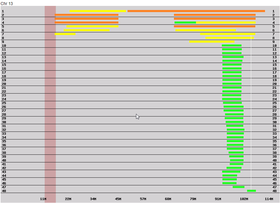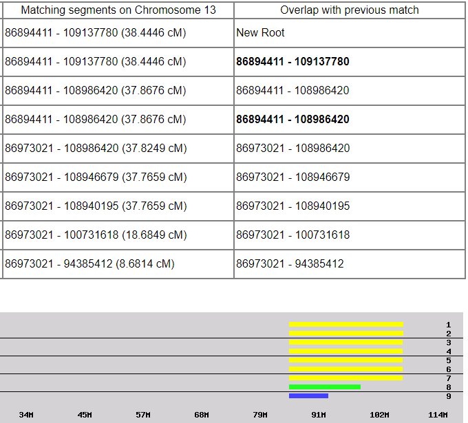 When I run the utility at Gedmatch to find common matches of Joyce and Lee, I get this on Chromosome 13: