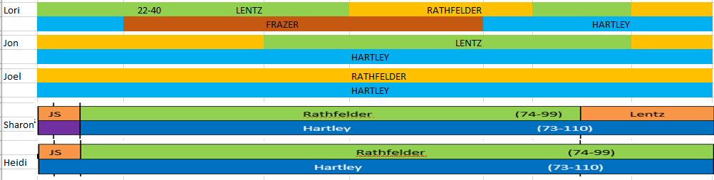 Here blue is the Hartley grandfather’s DNA that my siblings I and each received. My siblings and I match Lee from 87-109M. Lori’s Hartley segment starts around 85M. It is rare that all 5 siblings would have DNA from the same grandparent on the same segment. That means that after aboiut 85M we got no DNA from our paternal grandmother (Frazer).