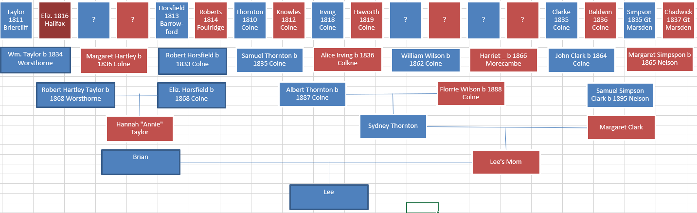 Great and Little Marsden is the area between Trawden and Nelson. #5 William Taylor of Worsthorne was not that far away. Here is a tree for Lee where I think my Hartley’s should match: