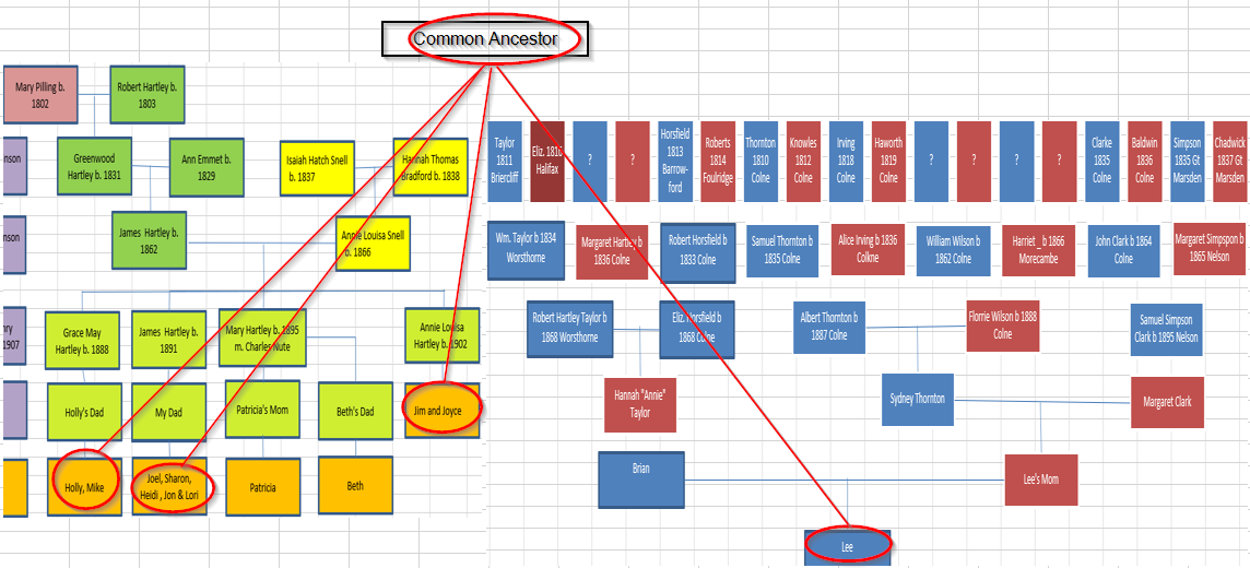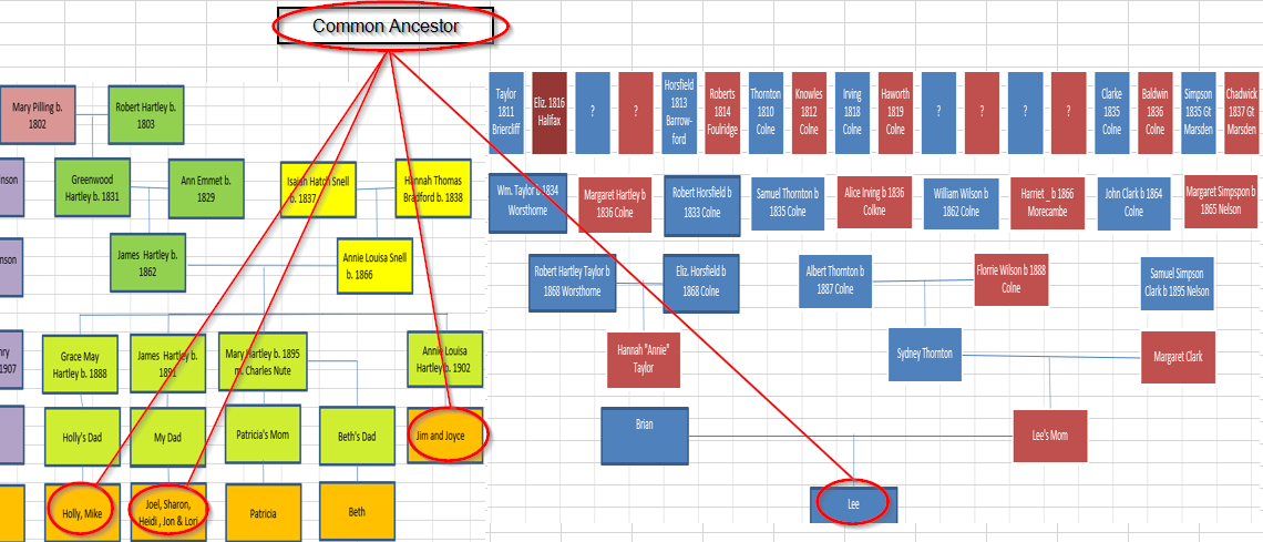 Normally if these people were in a TG, we wouldn’t know if the ancestor represented was James Hartley b. 1862 or his wife Annie Snell. However, Annie Snell was from Massachusetts and her ancestors went back to Colonial times. This TG also includes Lee, so the match must go back from James Hartley and back to his father who was born in Trawden which was part of the Parish of Colne where Lee had ancestors. Before Greenwood are other ancestors where Lee and the rest of my family may match.