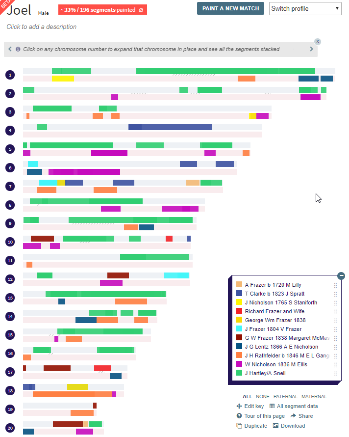 This shows that 46% of my paternal side is filled in. On my maternal side which I don’t show above, I have only 20% filled in. When I choose just the green matches which represent my Hartley/Snell DNA that I share with cousins, the DNA Painter program says that “represents about 17% of the base pairs in this profile”.
