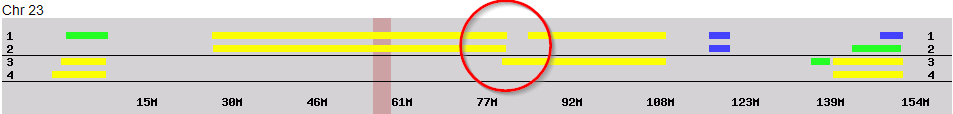 Remember I said that I thought that most of Maury’s X matches would be on his Snell side. For Maury’s group of matches in the middle, they stop at position 83M. My guess is that is where Maury’s X Chromosome goes from Snell DNA to Hartley DNA. After position 83M, Maury’s X matches disappear.