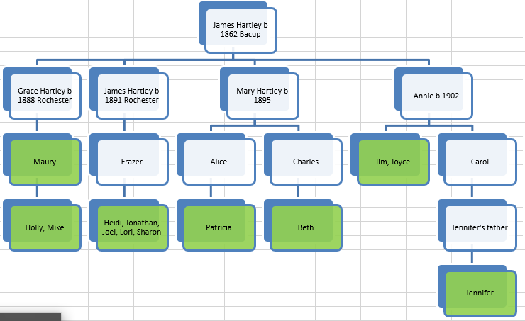 Maury’s mom Grace is circled in red on the right. Jim and Joyce’s mom Annie is circled in red on the left. From my generation, there are descendants of Jim circled in yellow and Mary also circled in yellow. That represents four out of thirteen Hartleys with DNA-tested descendants. I have other second cousins that have tested at AncestryDNA, but they have not uploaded their results to gedmatch for analysis.
