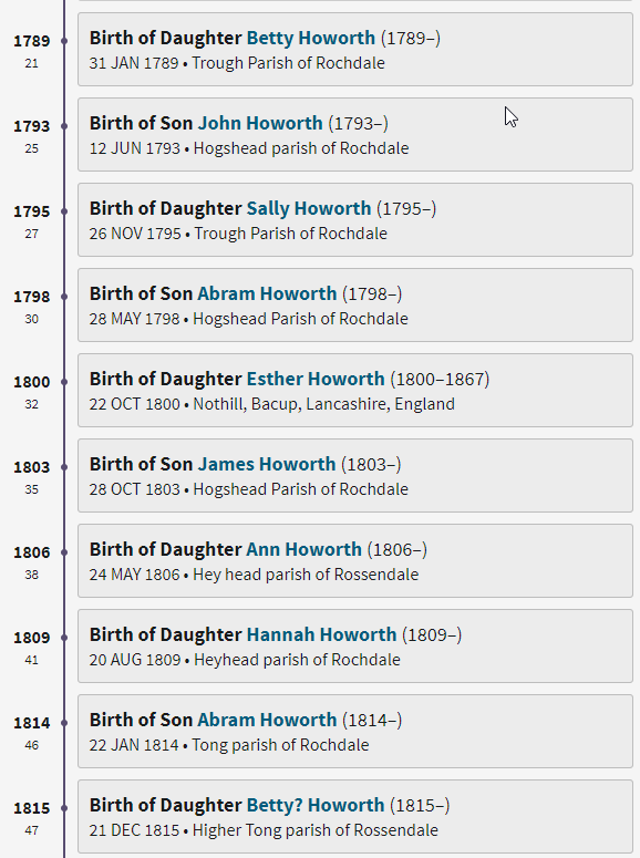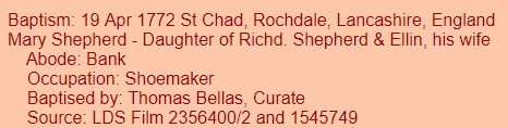 I would favor the Rochdale listings as Bury and Manchester were further away. That leaves Shepherd, Holt, or Eastwood as the last name for Mary. I’ll make the assumption that Mary was the mother of all the children above. The last child was born in 1815 when James was 47.  I’ll say that Mary was three years younger than James and was 44 when her last child was born. That would mean that she would have been about 18 when she married. That would put her birth about 1771.