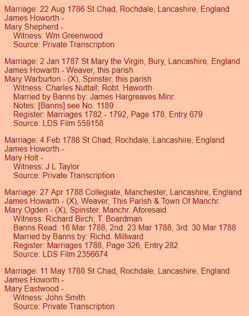 I’ll look at a website called Lancashire Online Parish Clerks where I got the information from the previous screen shot. I would think that Abraham and Mary married about 1787. When I enter a search for James Howorth marrying a Mary, I get 311 results.