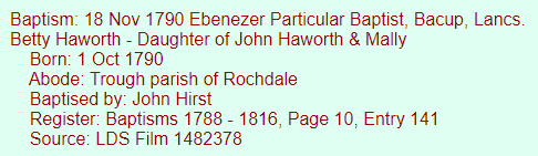 I like this Mary because her dad and mom were John and Betty. Mary’s first two known children were Betty and John. As I understand it, Bacup was originally not much of a place and Spotland was more of the area. So this my be a good place for an ancestor to be born.