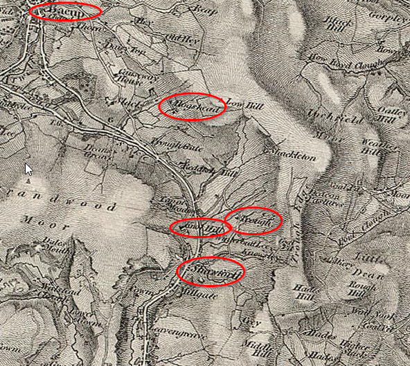 Also in the process, I have found Trough which I had trouble finding previously. I had assumed that Trough Gate was close and it is pretty close to Trough. The trick is finding an old enough map with enough detail. For some reason I get a lot of joy in figuring out where my ancestors lived. So, I’ll say that in 1800 at least, the Howorth family was living at Knot HIll aka Nothill. One problem is that place names have changed over the years. I would have to say that being born at Knot Hill sounds more prestigious than being born at Hogshead or Trough.