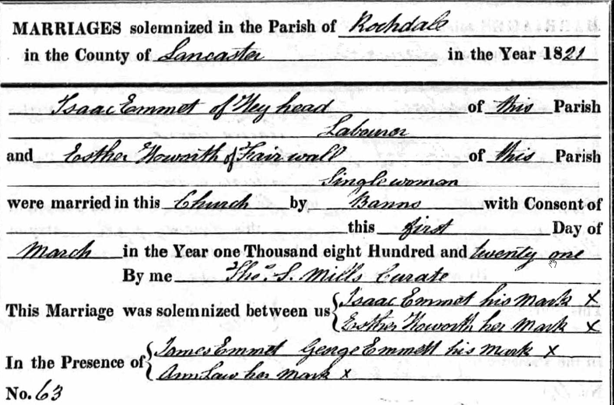 At this point I would be willing to go with what is behind door number three. I also note that Isaac Emmet was from Hey Head in the Parish of Rochdale at the time of his marriage.