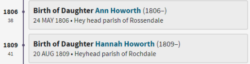 Ann Howorth is born in Hey head, parish of Rossendale. Hannah Howorth is born in Heyhead, parish of Rochdale. All other Howorth children have been born in the parish of Rochdale (except for the last Betty which also seems to be a mistake). That leaves a few possibilities: