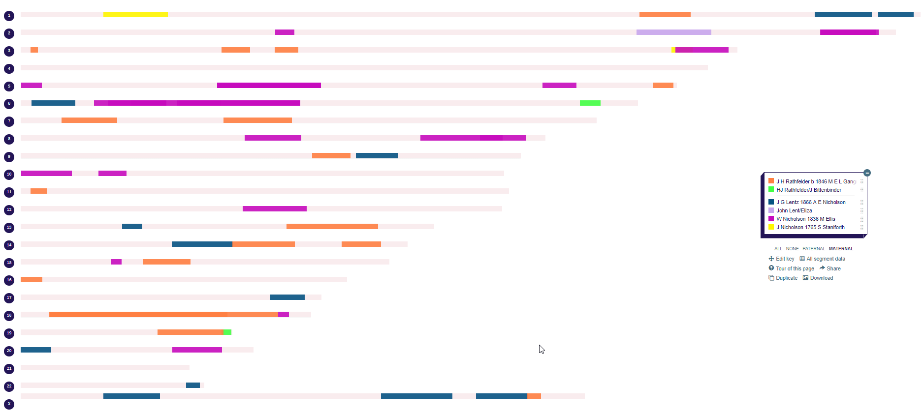I added Nigel in lilac. Then I moved the ancestral DNA his match represents down to the maternal side of the Map’s Key. By default, the new ancestors appear at the top of the key.