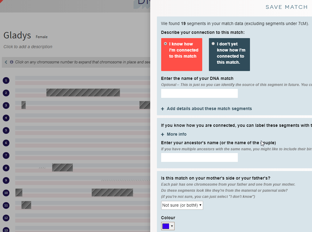 In the background there is a grey hatched area of the matches. DNA Painter does not yet know if these are maternal or paternal matches for my mom. They are paternal and I need to put in Anita’s name in the first box and the shared ancestors’ names in the second box. I’ll choose father’s side in the drop-down box and go with the suggested color.