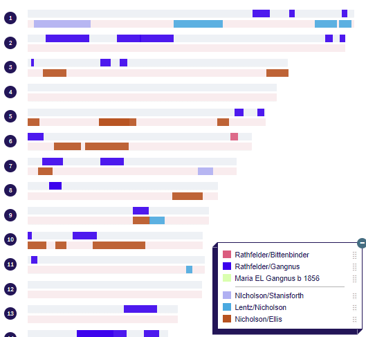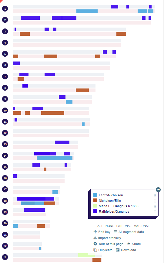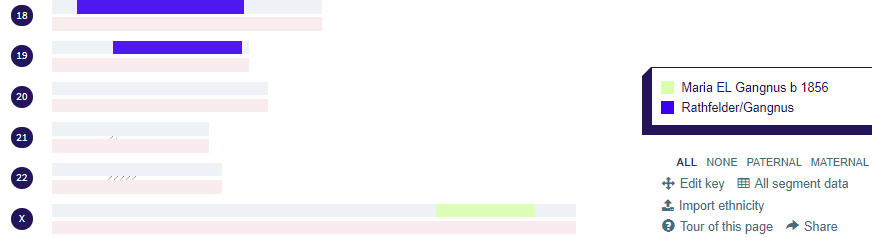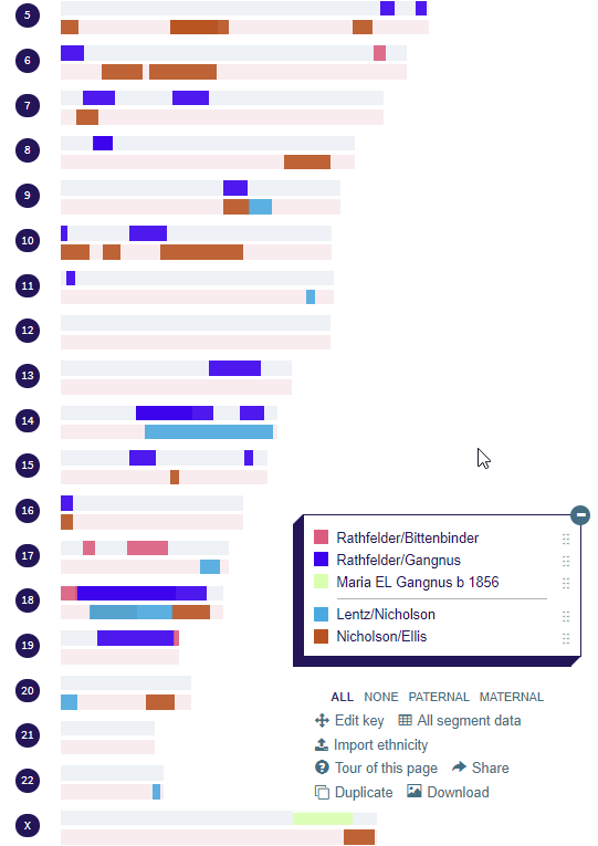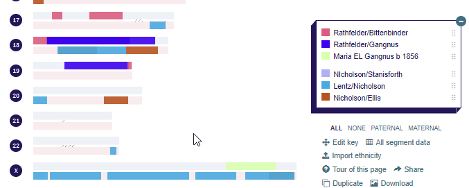 When I added this X Chromosome match with Anita, I had to add Anita in again. That means that I now have two entries for Anita in DNA Painter. One has common ancestors Rathfelder and Gangnus and the one on the X Chromosome has just Gangnus as a common ancestor.