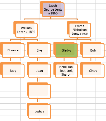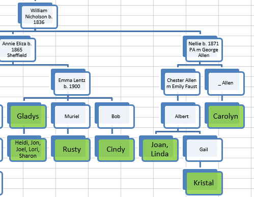 This is from a partial Nicholson Tree. However, Gladys and Carolyn need to also match on William Nicholson’s wife Martha Ellis. Both these people were born in Sheffield, England. Technically Gladys and Carolyn will be matching on either Nicholson or Ellis, but we won’t know which in most cases.