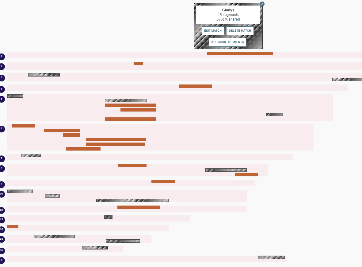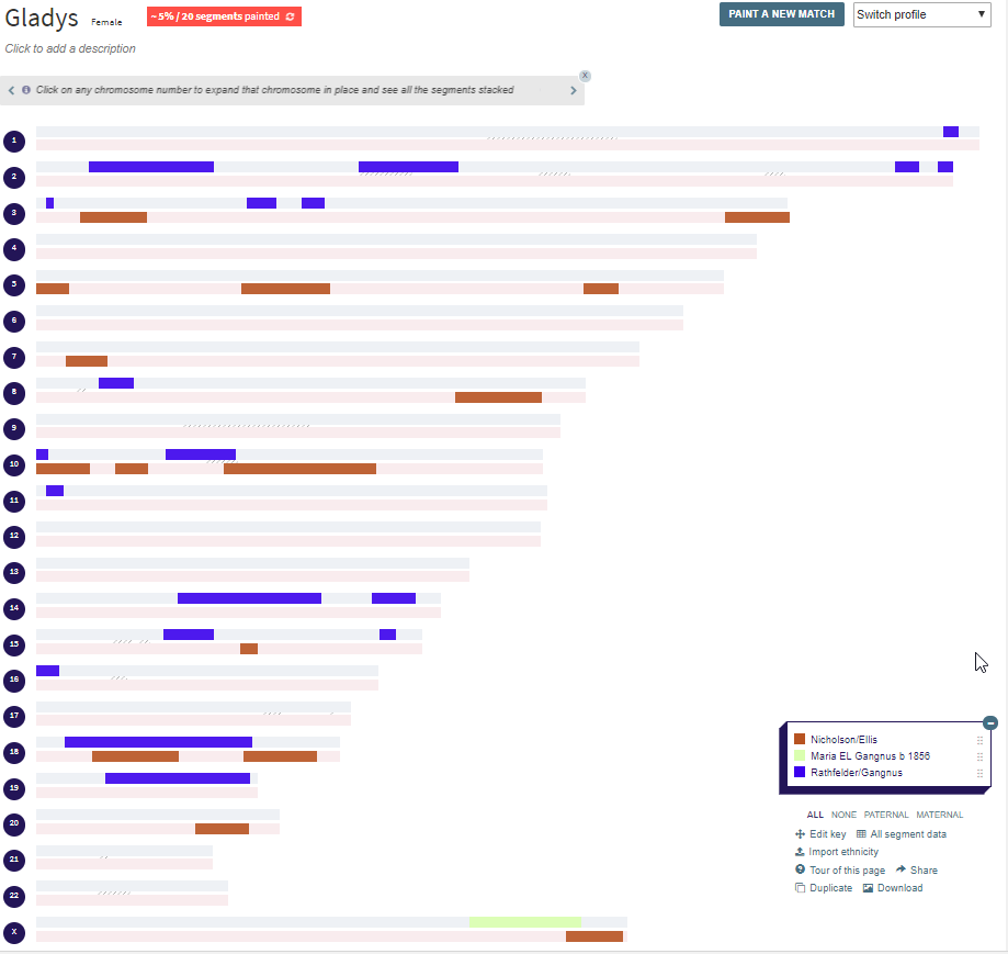 That represents 22% of my maternal side. Because my mom gave me half of her DNA, I should be able to get her to a higher overall percent. Let’s see what percentage we can get Gladys up to.