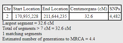 This shows on my maternal Chromosome 2, I had a 16 cM match with Radelle. I also have her Gedmatch number written down, so I can look for that match on my mom’s Gedmatch match list. My mom’s match with Radelle is about twice the match that I have with Radelle: