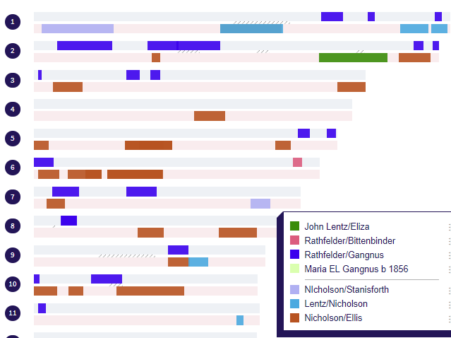 Adding my mom’s 1st cousin once removed, Catherine, get’s mom up to 12% mapped DNA. Judy brings in a new pair of ancestors: Jacob Lentz and Annie Nicholson.