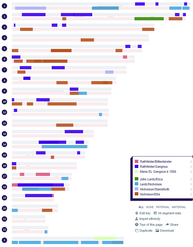 That about as far as I will get as my own maternal chromosomes are also at 22%.