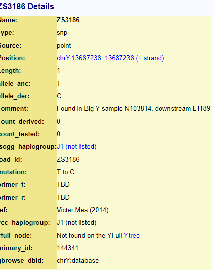 This was found in 2014 but never added to a YTree. It is in the J1 Haplogroup. For this reason, this SNP may be not considered good. Or, it may be determined that the original sample was in error(?) Again, we need some help from FTDNA or YFull in figuring this one out.