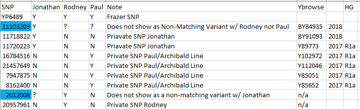These are likely Variants on Paul’s side (the Archibald Line) which are not on the James Line side of the Frazer tree. The problem with these Variants is that they will not be named as SNPs unless someone else tests positive for them. There are two ways that this could happen. One would be that Rick (from the Archibald Line) takes a BigY test. Or, tests could be requested for each of the variants above and Rick (or another Archibald direct line male descendant) could test for the individual SNPs once there is a test protocol.