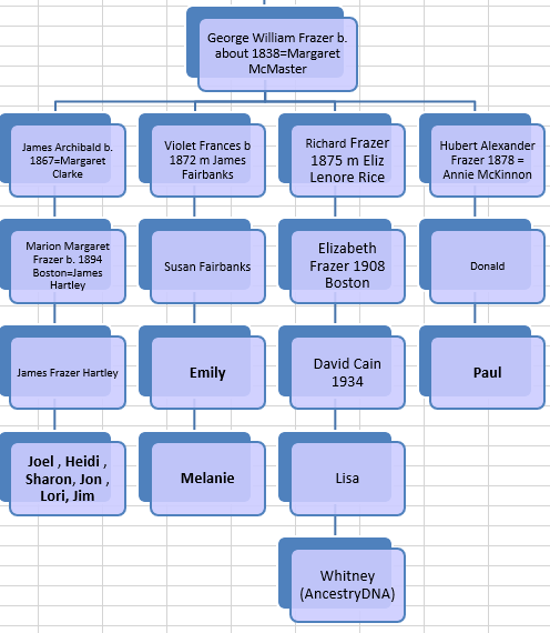 Here is Whitney in my DNA/Frazer Genealogy Chart:
