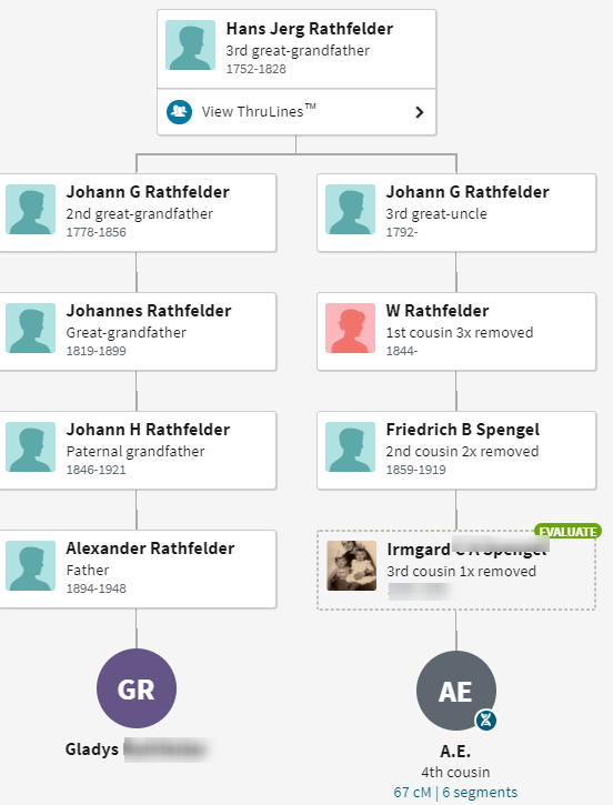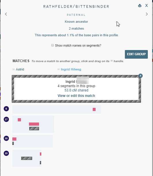 I have at DNA Painter, that my mom’s common ancestors with Astrid are Rathfelder and Bittenbinder. That also agrees with Ancestry.com: