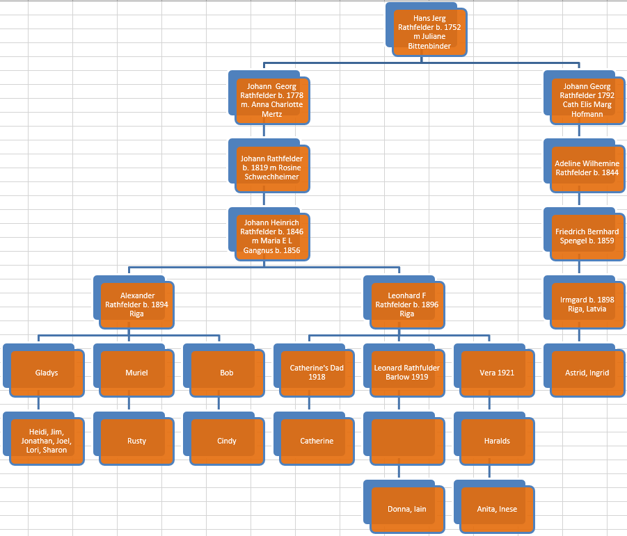 Every time you go through a generation, some specific DNA is lost or diluted. Also my representation of Rathfelder and Bittenbinder has a pink background as they are on my Maternal side. For my mom, they are on her Paternal side.