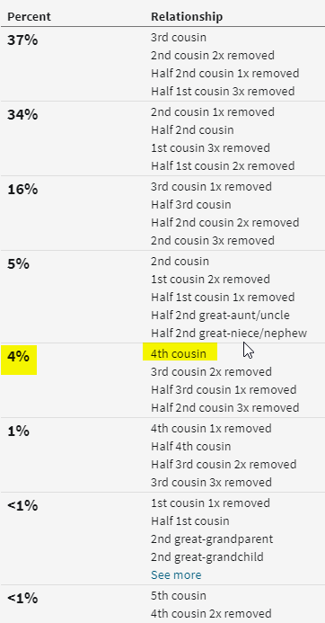 That’s a pretty big change. Now my Mom is a fourth cousin with Astrid and Ingrid. With the amount of DNA shared between my mom and Astrid, Ancestry says they have a 4% chance of being fourth cousins: