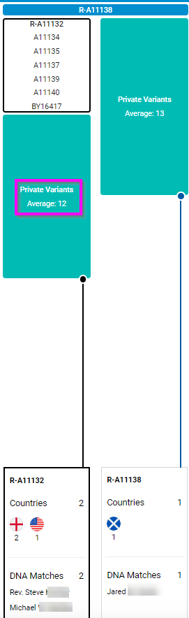 For the other two testers, there are 7 non-named private variants. It is my understanding that FTDNA uses these unnamed variants when they do their averaging. I have 6 private variants and the other two testers have a total of 7 for a grand total of 13 private variants. Divide these by 4 to get the 12 average private variants under A11132.